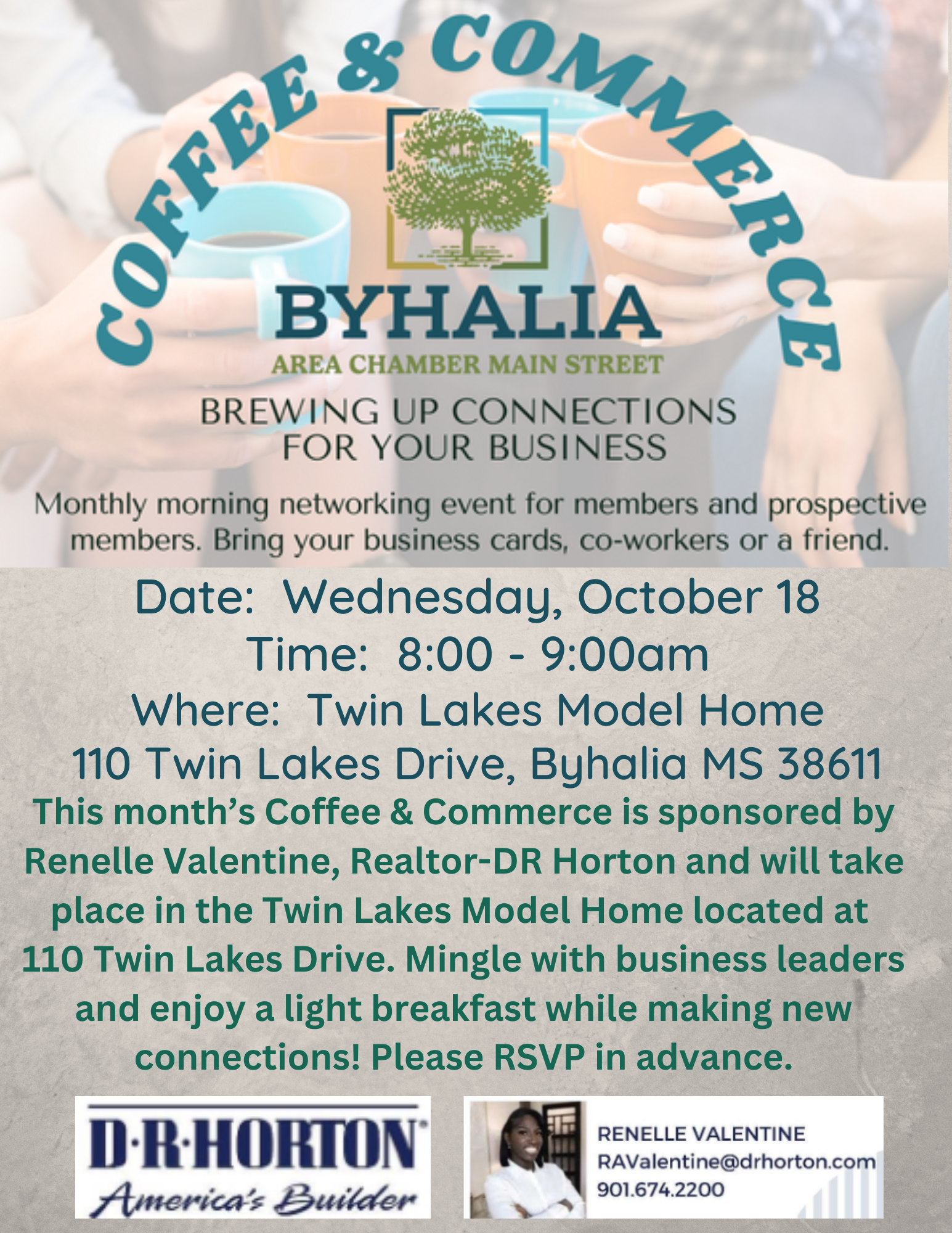 This month's event is sponsored by Renelle Valentine, Realtor-DR Horton and will take place in the Twin Lakes Model Home located at 110 Twin Lakes Drive in Byhalia.